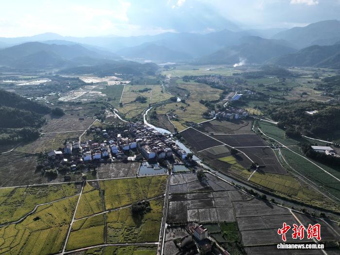 10月15日,秋收时节,在福建省沙县夏茅镇,俯瞰村庄,稻田色彩斑斓,诱人。 (无人机拍摄)中新网记者 张斌 摄